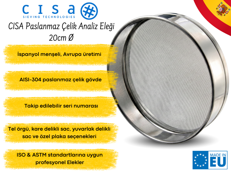 CISA Sieving Technologies, laboratuvar ve endüstriyel eleme teknolojileri alanında uzmanlaşmış, İspanya merkezli köklü bir üretici markadır. Firma; ISO, AFNOR, ASTM, DIN, BS ve UNE gibi uluslararası standartlara uygun yüksek hassasiyetli analiz elekleri üretmesiyle tanınmaktadır