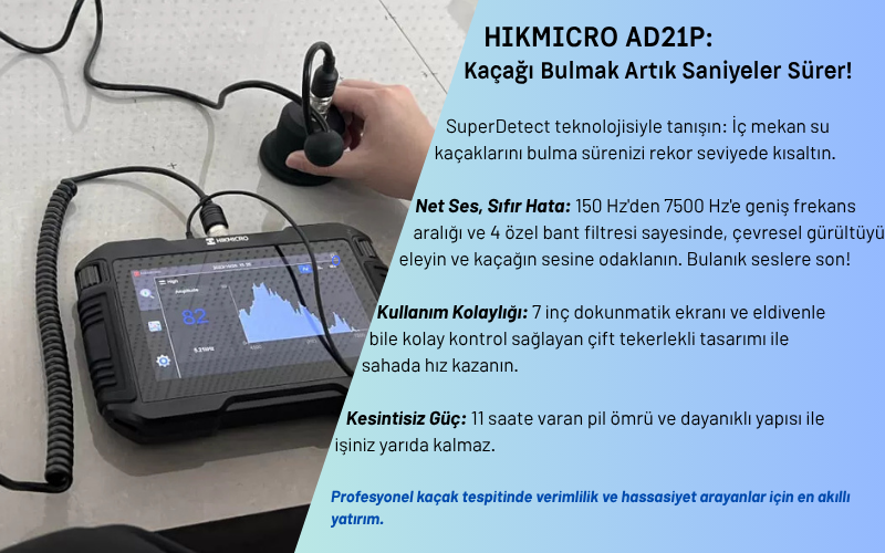 HIKMICRO AD21P akustik kaçak tespit cihazı, gelişmiş SuperDetect özelliğiyle donatılmış yüksek performanslı bir dinleme cihazıdır.