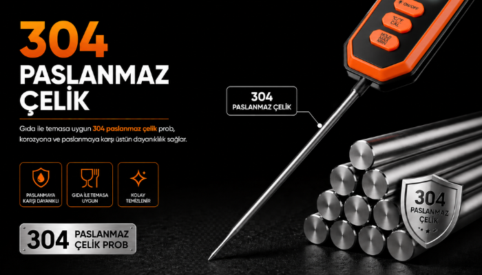- 304 paslanmaz çelik prob ve sensör ucu, yoğun mutfak kullanımı, sık ölçüm ve temizlik süreçlerinde dayanıklılığı destekleyen sağlam ve uzun ömürlü bir yapı sağlar.