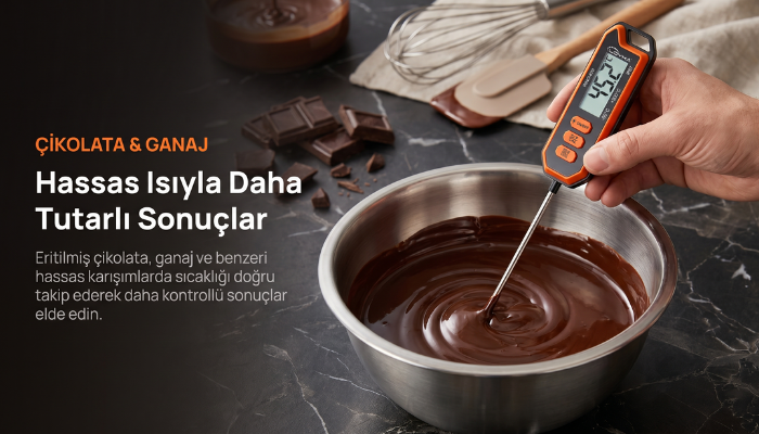Çikolata, ganaj ve benzeri hassas karışımlarda sıcaklık kontrolü, kıvam ve sonuç kalitesi açısından önemlidir. INNO-670 dijital gıda termometresi, hassas ısı takibi sayesinde eritme, karıştırma ve kontrollü hazırlık süreçlerinde daha stabil ve daha tutarlı sonuçlar elde edilmesine yardımcı olur.