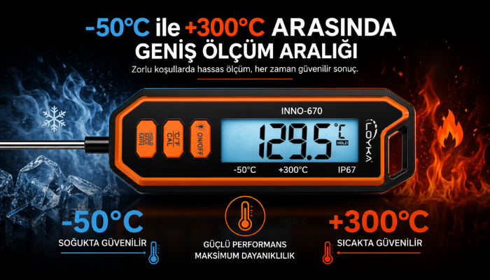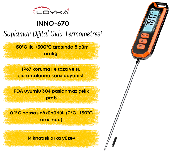 - Loyka INNO-670 saplamalı dijital gıda termometresi, -50°C ile +300°C arasındaki geniş ölçüm aralığı sayesinde et, tavuk, balık, hamur işleri, kızartma yağı ve farklı sıcak servis ürünlerinde çok yönlü sıcaklık ölçümü yapılmasına yardımcı olur.
