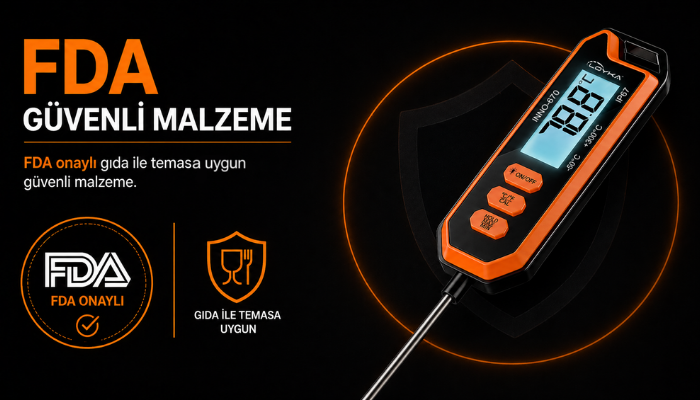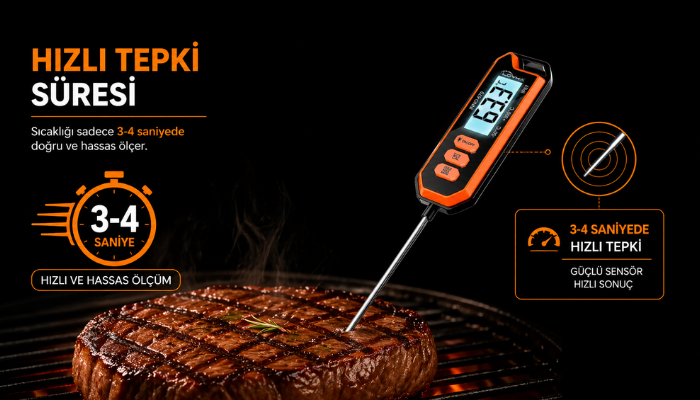 - Hızlı tepki süresi, ölçüm sonucunun kısa sürede ekrana yansımasını destekleyerek pişirme sırasında kapağı uzun süre açık tutmadan veya ürünü gereğinden fazla bekletmeden pratik sıcaklık takibi yapılmasını kolaylaştırır.