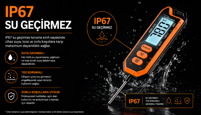 INNO-670 saplamalı gıda termometresi, IP67 koruma sınıfı sayesinde toza karşı tam koruma sunar; su sıçraması, kontrollü yıkama ve yoğun kullanım gibi zorlu mutfak koşullarında güvenilir performans sağlayarak profesyonel ve ev tipi gıda uygulamalarına uygun dayanıklı bir yapı sunar.