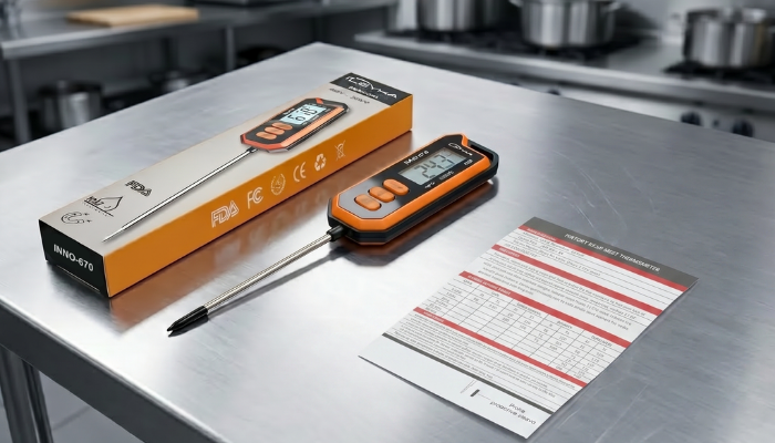 INNO-670, FDA uyumlu ve gıda ile temasa uygun prob yapısı sayesinde yiyeceklerin iç sıcaklığını güvenli şekilde ölçmeye yardımcı olur; mutfak kullanımında hijyen, güvenilir temas ve kullanım amacına uygun yapı avantajı sunar.