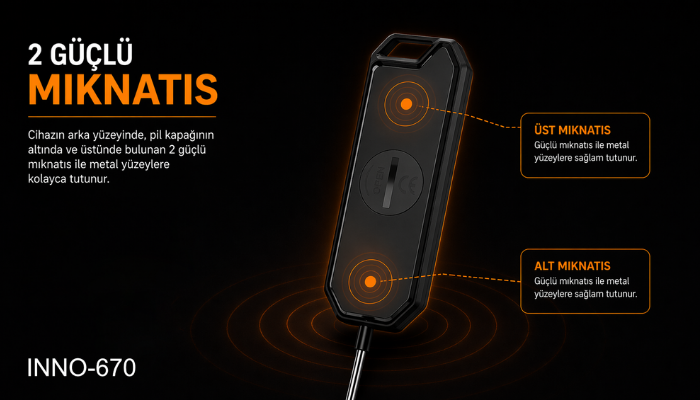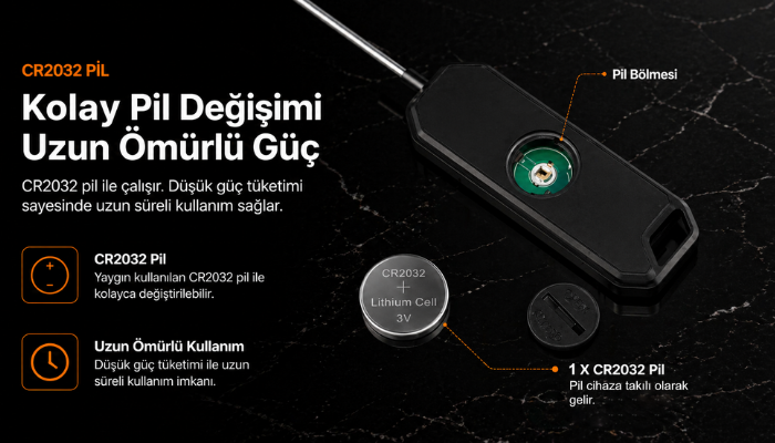 INNO-670, yaygın olarak temin edilebilen CR2032 pil ile çalışır; düşük güç tüketimi sayesinde uzun süreli kullanım sunarken, pratik pil değişim yapısı ile günlük mutfak ve profesyonel kullanımda kullanım kolaylığı sağlar.