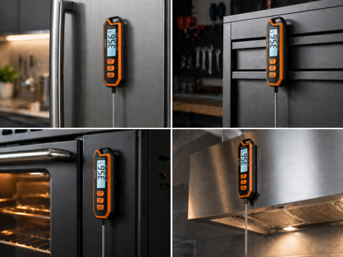 - Mıknatıslı arka yüzey yapısı ve kompakt gövde tasarımı, dijital gıda termometresinin metal yüzeylere geçici olarak sabitlenmesini ve kullanım sonrasında daha düzenli şekilde saklanmasını kolaylaştırır.