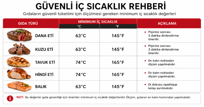 INNO-670 gıda termometresi ile et, tavuk, balık ve diğer gıdalarda önerilen minimum iç sıcaklık değerleri kolayca kontrol edilebilir. Bu sayede daha güvenli, daha kontrollü ve daha tutarlı pişirme sonuçları elde edilmesine yardımcı olur.
