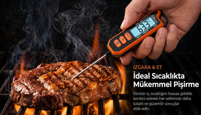 INNO-670 saplamalı gıda termometresi, ızgara et, kırmızı et ve benzeri ürünlerde iç sıcaklığı hassas şekilde ölçerek pişirme derecesinin daha kontrollü belirlenmesine yardımcı olur. Etin en kalın noktasından yapılan ölçümler sayesinde daha güvenli ve daha tutarlı pişirme sonuçları elde edilebilir.
