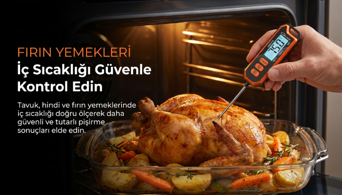 INNO-670 dijital gıda termometresi; tavuk, hindi ve fırın yemeklerinde iç sıcaklığı doğru şekilde kontrol etmek için pratik kullanım sunar. Özellikle kalın yapılı fırın tariflerinde iç kısmın yeterli sıcaklığa ulaşıp ulaşmadığını kontrol ederek daha güvenli tüketim ve daha dengeli pişirme sağlar.