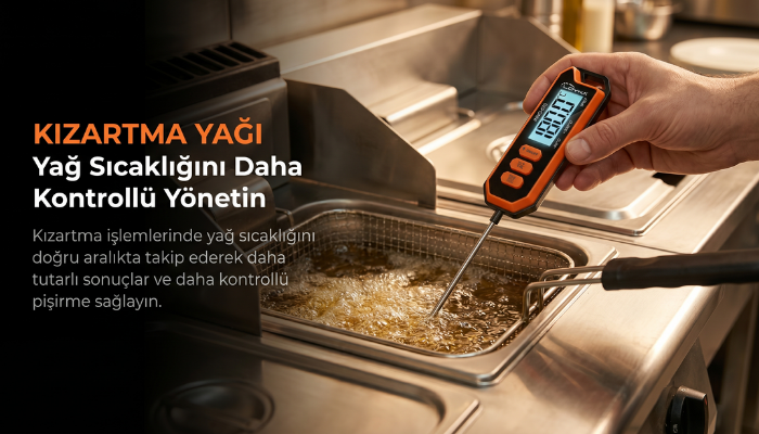 INNO-670 saplamalı termometre, kızartma yağı sıcaklığını uygun aralıkta takip ederek daha kontrollü pişirme süreci sağlar. Yağın gereğinden düşük veya yüksek sıcaklığa çıkmasını önlemeye yardımcı olarak hem ürün kalitesinin korunmasını destekler hem de daha tutarlı kızartma sonuçları sunar.