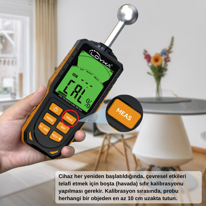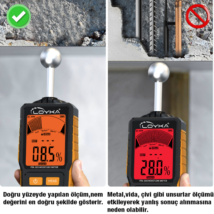 - LOYKA PİN-100, ölçüm sonuçlarını yalnızca sayısal olarak değil, aynı zamanda ekrandaki bar-graph nem göstergesi üzerinden de görsel olarak sunar. Bu yapı sayesinde kullanıcı, ölçüm noktasındaki nem seviyesini kuru, nemli veya yüksek nemli bölge olarak daha hızlı yorumlayabilir ve seri taramalarda riskli alanları daha kolay ayırt edebilir.