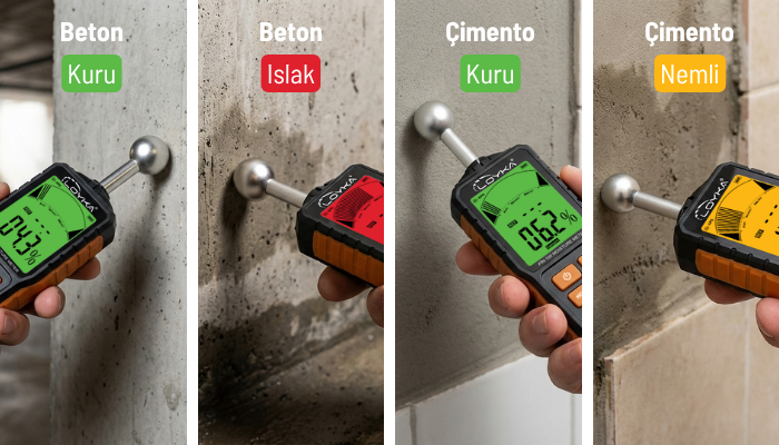 Çimento esaslı şap, harç, seramik karo ve benzeri daha yoğun yapı malzemelerinde kullanılmak üzere optimize edilmiştir. Özellikle zemin kaplamaları ile banyo, mutfak ve benzeri nem yükünün daha yüksek olduğu alanlarda daha kontrollü ölçüm yapılmasını destekler; su sızıntısı ve nem kaynaklı problemlerin erken aşamada belirlenmesine katkı sağlar.