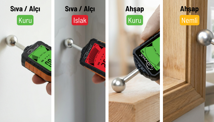 Alçı, macun, sıva, tuğla ve benzeri orta yoğunluklu yapı yüzeylerinde daha dengeli ve karşılaştırılabilir ölçüm sonuçları sunar. Özellikle duvar içi nem birikimi, rutubet kaynaklı sorunlar ve boya altında oluşabilecek kabarma risklerinin değerlendirilmesinde daha güvenilir ölçüm yapılmasına yardımcı olur.