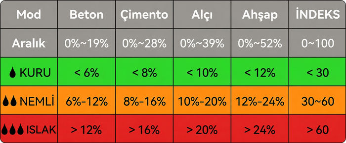 - Kullanım kılavuzunda belirtilen ölçüm aralıklarına göre cihaz; betonda 0–19%, çimentoda 0–28%, sıva / alçı yüzeylerde 0–39% ve ahşapta 0–52% aralığında ölçüm gösterebilir. Bu yapı, farklı malzeme sınıflarında ölçüm sonuçlarının daha uygun şekilde değerlendirilmesine destek verir.