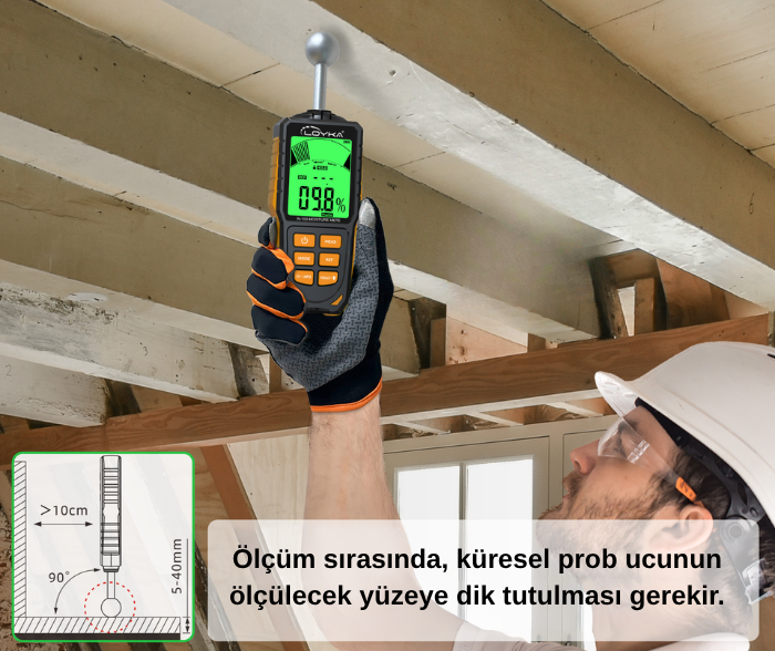 - Küresel sensör prob yapısı, yüzeye pin batırmadan ölçüm yapılmasına imkân tanırken maksimum 40 mm’ye kadar algılama / nüfuz derinliği sunar. Bu sayede yüzey altındaki nem değişimleri daha pratik şekilde taranabilir. Daha sağlıklı ölçüm için kılavuzda, ölçüm yapılacak malzeme kalınlığının en az 5 mm olması tavsiye edilmektedir.