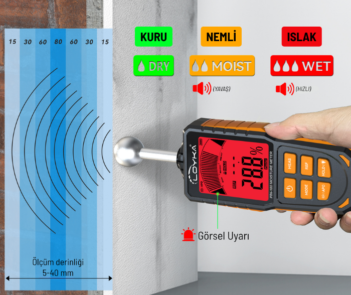 LOYKA PİN-100, yüzeye zarar vermeden 5–40 mm derinliğe kadar nem taraması yaparak kuru, nemli ve yüksek nemli bölgelerin hızlı şekilde ayırt edilmesine yardımcı olur. Renkli ekranı sayesinde nem seviyesini görsel olarak takip etmeyi kolaylaştırırken, sesli alarm desteği ile ölçüm sonuçlarının daha hızlı ve daha anlaşılır şekilde değerlendirilmesini destekler.