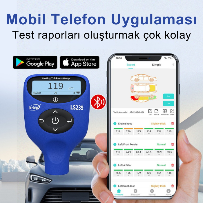 LS239 kalınlık ölçer, Basit Mod ve Uzman Modu olmak üzere iki farklı ölçüm modu ile esnek kullanım imkânı sunar. Basit Mod, tüm yüzeylerde standart boya kalınlık ölçümlerinin hızlı ve pratik şekilde yapılması için kullanılır. Uzman Modu ise otomobiller üzerinde detaylı, profesyonel boya kalınlık tespiti ve sistemli raporlama gerektiren uygulamalar için geliştirilmiştir; bu mod sayesinde araç üzerindeki boya işlemleri tüm ayrıntılarıyla analiz edilebilir.