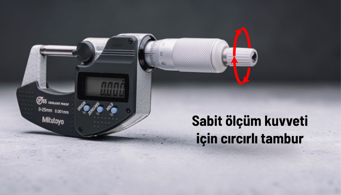 Dijital dış çap mikrometresinde yer alan cırcırlı tambur (ratchet stop) mekanizması, ölçüm esnasında daha sabit ve kontrollü bir ölçme kuvveti oluşturarak hassas çap ölçümlerinde daha tutarlı, kararlı ve tekrarlanabilir sonuçlar alınmasına katkı sağlar.