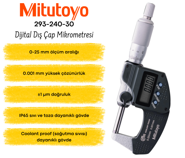 Mitutoyo 293-240-30 dijital dış çap mikrometresi; 0-25 mm ölçüm kapasitesi, 0.001 mm hassas çözünürlüğü ve ±1 µm doğruluk değeri ile profesyonel ölçüm uygulamalarına yönelik geliştirilmiş IP65 korumalı bir dış çap mikrometresidir.