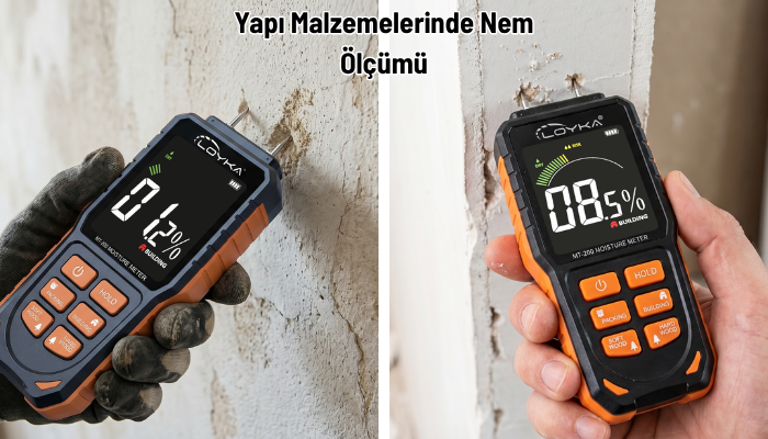 Sıva, alçı, çimento şapı, gaz beton ve benzeri yapı malzemelerinde noktasal nem kontrolü yapılmasına yardımcı olur. Yüzey kuruluğunun izlenmesi, tadilat öncesi değerlendirme ve nem riski tespiti gibi uygulamalarda kullanıma uygundur.