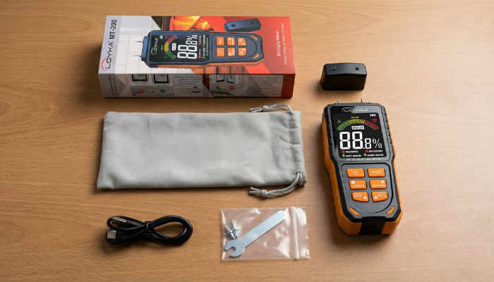 Kutu içeriğinde 1 adet MT-200 iğne problu nem ölçer, 1 adet koruyucu prob kapağı, 1 adet taşıma kesesi, 1 adet USB-A’dan USB-C’ye şarj kablosu, 2 adet yedek iğne prob ve prob değişimi için 1 adet anahtar bulunmaktadır. Türkçe kullanma kılavuzuna kutu arkasındaki QR kodu okutarak ulaşabilirsiniz.