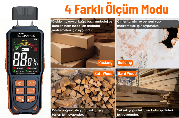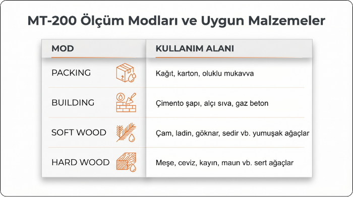 - MT-200; Yumuşak Ahşap (Soft Wood), Sert Ahşap (Hard Wood), Yapı Malzemesi (Building) ve Ambalaj Malzemesi (Packing) olmak üzere 4 farklı ölçüm moduna sahiptir. Bu sayede malzeme tipine uygun mod seçilerek daha anlamlı ve karşılaştırılabilir sonuçlar elde edilmesine yardımcı olur.