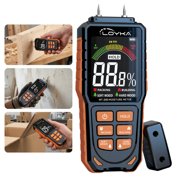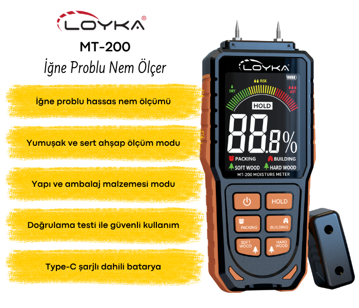 MT-200 iğne problu nem ölçer; ahşap, yapı malzemeleri ve ambalaj malzemelerinde nem seviyesini doğrudan temaslı ve noktasal olarak kontrol etmeye yardımcı olan profesyonel bir ölçüm cihazıdır. Pinsiz modellere göre, iğne probları ölçüm yapılacak yüzeye doğrudan uygulanarak seçilen bölgedeki nem durumunun daha lokal ve kontrollü şekilde değerlendirilmesini destekler. Soft Wood, Hard Wood, Building ve Packing olmak üzere 4 ayrı ölçüm modu, sesli ve ışıklı uyarı desteği, HOLD fonksiyonu ve Type-C şarjlı yapısı sayesinde saha, atölye ve kontrol süreçlerinde pratik, esnek ve çok yönlü kullanım sunar.