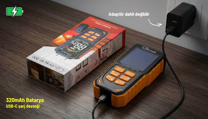 - 320 mAh dahili lityum batarya ile çalışan cihaz, Type-C bağlantı üzerinden şarj edilebilir. Tek kullanımlık pil ihtiyacını azaltan bu yapı, saha ve atölye kullanımında daha pratik enerji yönetimi sunar.