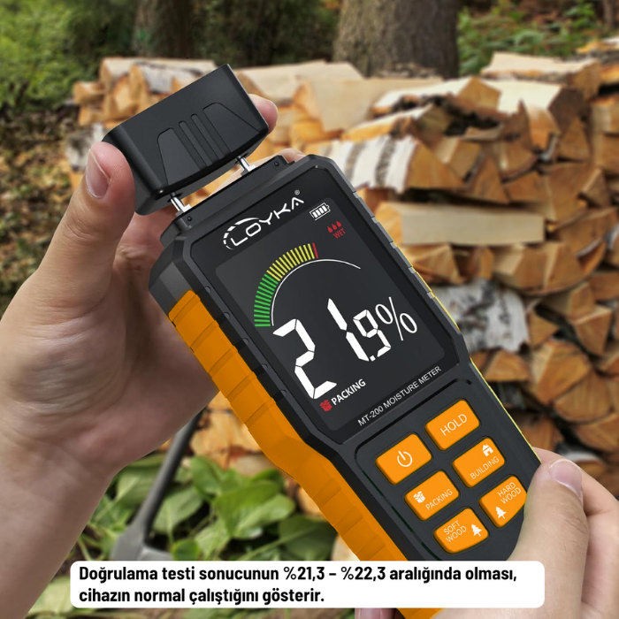 MT-200, ölçüm öncesinde cihazın temel çalışma durumunu hızlıca kontrol etmeye yardımcı olan pratik bir doğrulama testi fonksiyonuna sahiptir. Cihaz PACKING moduna alındığında, problar koruyucu kapağın üst bölümündeki test deliklerine yerleştirilerek referans kontrolü yapılabilir. Ekranda görülen değerin %21,3 – %22,3 aralığında olması, cihazın normal çalıştığını ve ölçüme hazır olduğunu gösterir. Sonuç bu aralığın dışında kalırsa, cihaz üzerinden manuel kalibrasyon uygulanarak ölçüm doğruluğu yeniden ayarlanabilir.