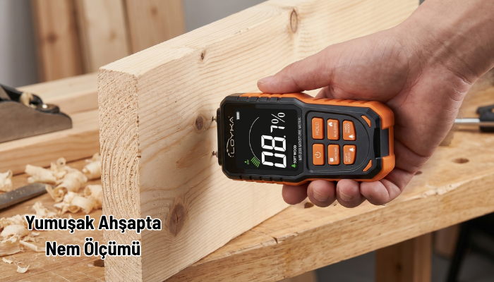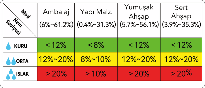 - Ölçüm aralıkları malzeme tipine göre değişmektedir: Ambalaj Malzemesi (Packing): %6.0 – %61.2, Yapı Malzemesi (Building): %0.4 – %31.3, Yumuşak Ahşap (Soft Wood): %5.7 – %56.1, Sert Ahşap (Hard Wood): %3.9 – %35.3. Bu yapı, farklı malzemeler için tek bir sabit aralık yerine daha uygun ölçüm yaklaşımı sunar.