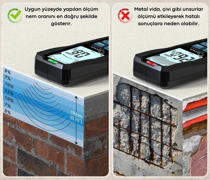 - Manyetik (indüktif) ölçüm sistemi ve harici iğne tipi prob desteği ile farklı yüzeylerde esnek ve güvenilir nem analizi yapar.