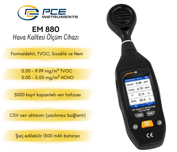 PCE-EM 880; formaldehit (HCHO) ve TVOC değerlerini sıcaklık ve nem parametreleri ile birlikte ölçerek ortam havasının çok yönlü şekilde izlenmesini sağlar. Böylece hem toplam VOC yükü hem de formaldehit kaynaklı risk aynı anda kontrol altında tutulabilir.