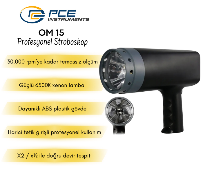 PCE-OM 15 stroboskop, motorlar, makineler ve aktarma mekanizmaları gibi dönen sistemlerin temassız ve emniyetli biçimde incelenmesine olanak tanıyan profesyonel bir ölçüm cihazıdır. 30.000 rpm’ye kadar ölçüm yapabilme yeteneği, yüksek güçlü xenon flaşı ve harici tetik bağlantısı ile endüstriyel bakım, arıza teşhisi ve üretim süreçlerinde hassas sonuçlar elde edilmesini sağlar.