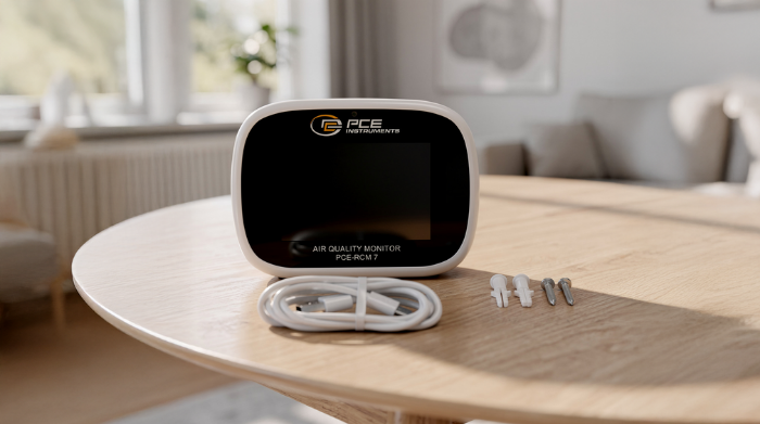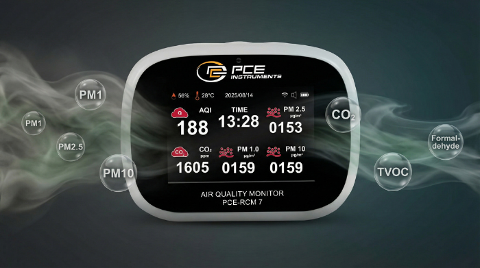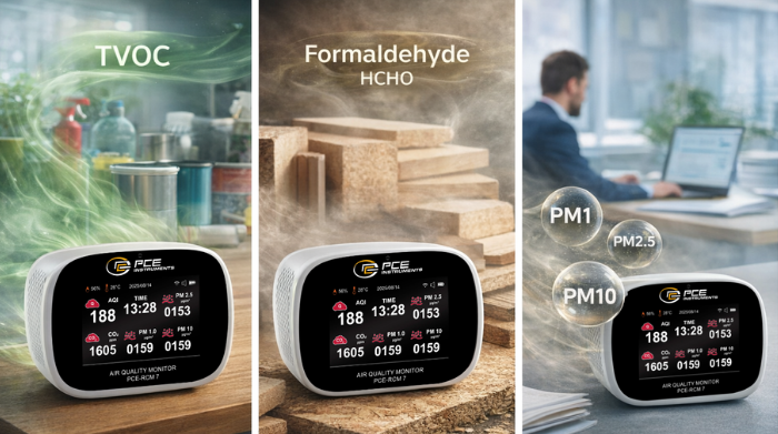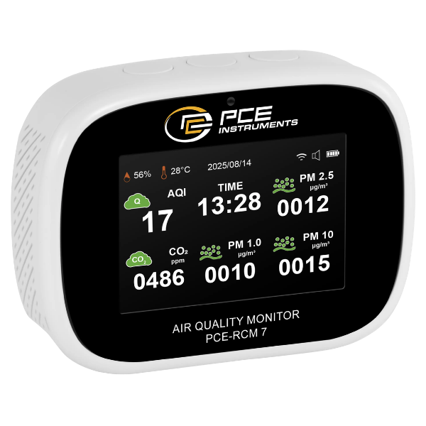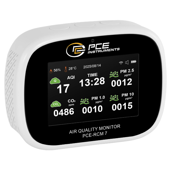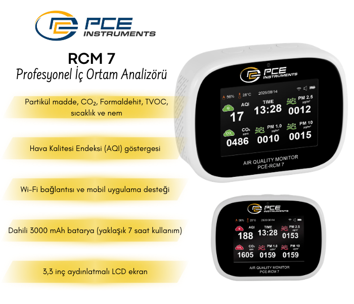 - PCE-RCM 7; 3,3 inç aydınlatmalı LCD ekranı üzerinden PM1, PM2.5, PM10, CO₂ (karbondioksit), formaldehit (HCHO) ve uçucu organik bileşikler (TVOC) değerlerini anlık olarak gösterir. Bununla birlikte ortam sıcaklığı ve bağıl nem ölçümü yaparak bulunduğunuz alanın hava kalitesini detaylı şekilde analiz etmenize imkân tanır.