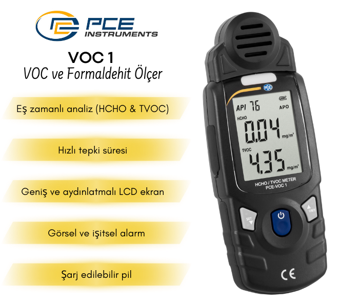 PCE-VOC 1, formaldehit ve TVOC (Toplam Uçucu Organik Bileşik) seviyelerini ölçmek için geliştirilmiş taşınabilir bir ölçüm cihazıdır. Ev, ofis, okul, fabrika ve laboratuvar gibi kapalı alanlarda hava kalitesinin hızlı ve kolay şekilde izlenmesine olanak tanır. Cihaz, kritik değerlere ulaşıldığında sesli ve görsel alarm vererek kullanıcıyı anında uyarır.