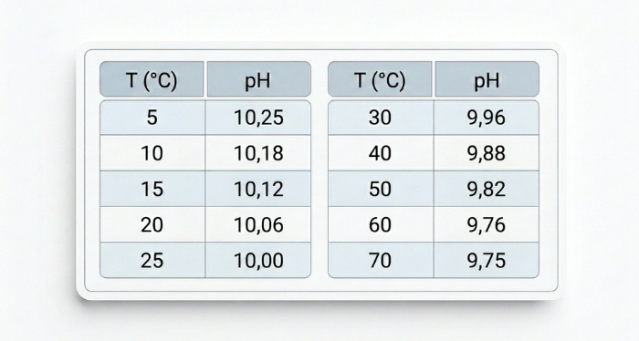 PH 10 kalibrasyon çözeltisinin sıcaklığa bağlı olarak değişebilen pH değerleri tabloda gösterilmektedir. Daha doğru ve tutarlı kalibrasyon sonuçları için işlem sırasında ortam sıcaklığına karşılık gelen referans değerin esas alınması önerilir.