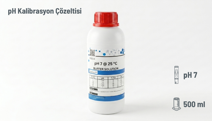 PH 7 kalibrasyon çözeltisi, PH metre cihazların nötr referans noktasında kalibrasyon ve doğrulama işlemleri için kullanılan standart bir PH tampon solüsyonudur. 500 ml şişe formunda sunulan bu çözelti, günlük PH metre kontrollerinde en sık tercih edilen referans sıvılardan biri olup cihazın temel ölçüm doğruluğunu değerlendirmeye yardımcı olur. 25°C’de PH 7 referans değeri sunarak laboratuvar, eğitim, su analizi ve rutin kalite kontrol uygulamalarında güvenilir ve kararlı kalibrasyon desteği sağlar.