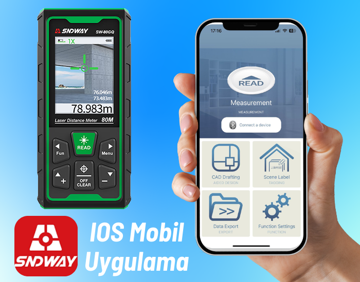 - Sndway SW-80GQ lazermetre, yalnızca Apple iOS işletim sistemine sahip akıllı telefonlarla uyumlu mobil uygulaması sayesinde cihaza Bluetooth üzerinden eşleştirilerek akıllı telefon aracılığıyla kontrol edilebilir; bu sayede ölçüm işlemleri uzaktan yönetilebilir, veriler telefon üzerinden görüntülenip pratik şekilde kullanılabilir.