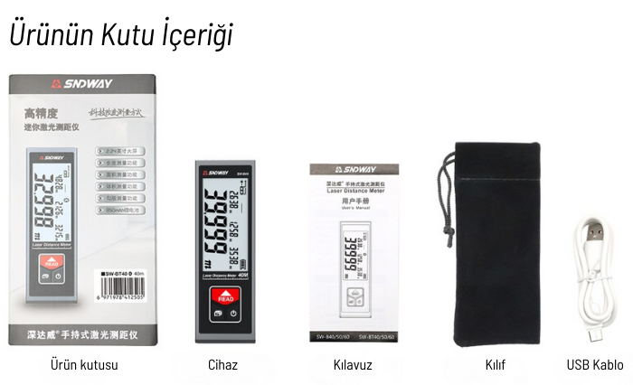 - Ürünün kutu içeriği; 1 adet SW-B40 lazer mesafe ölçer, 1 adet type C kablo, 1 adet taşıma kılıf ve 1 adet kullanım kılavuzu şeklindedir.