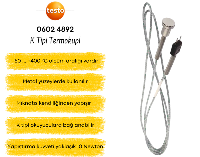 Testo 0602 4892 k tipi termokupl ürünü; uç kısmındaki mıknatıs yapı ile metal yüzeylere tutunarak -50 … +400 °C sıcaklık değerleri arasında ölçüm yapabilen yüksek kalitede bir sıcaklık ölçer probdur. Ölçüm yapabilmek için bir K tipi okuyucuya ihtiyaç durmaktadır.