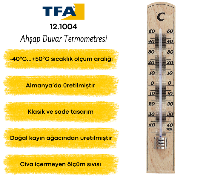 - TFA 12.1004 ahşap duvar termometresi, odanızın iç sıcaklığını ölçmek tasarlanmıştır. Bu sayede ortam sıcaklığını kontrol ederek hem konforunuzu artırabilir hem de enerji tüketimini optimize edebilirsiniz.