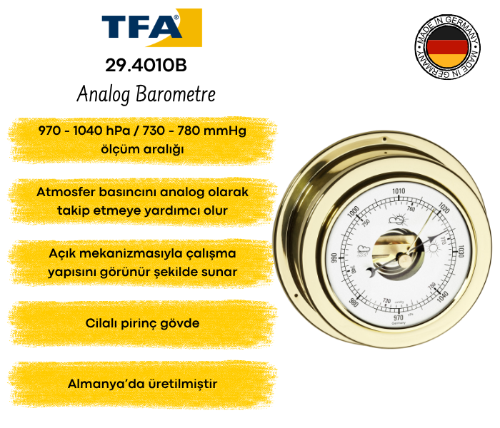 - TFA 29.4010B 'MARITIM' denizcilik için analog barometre, atmosfer basıncındaki değişimleri mekanik sistem üzerinden takip etmeye ve bu değişimlere göre yerel hava koşullarını yorumlamaya yardımcı olmak amacıyla geliştirilmiş klasik tip bir barometredir. Duvar tipi kullanıma uygun yapısı sayesinde özellikle iç mekânlarda hem işlevsel hem de dekoratif bir kullanım sunar.