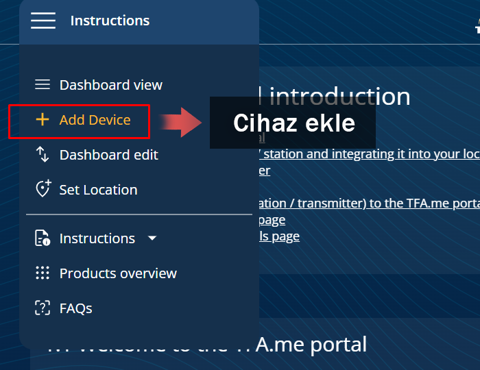 1 - Sitenin sol menüsünde yer alan “Instructions (Talimatlar)” bölümüne giderek “+ Add Device (Cihaz Ekle)” butonuna tıklayınız.