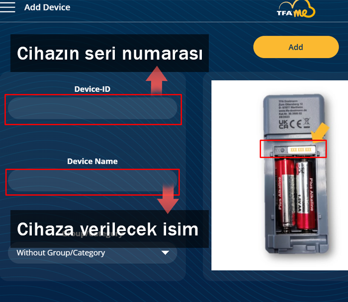 Portala kayıt olduktan sonrasında satın almış olduğunuz TFA model akıllı cihazını sisteme eklemek için;