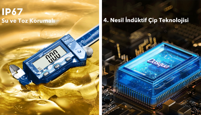 Suya ve toza karşı IP67 koruma seviyesi sunan Dasqua Blu 2015-1005-A, zorlu saha ve atölye koşullarında profesyonel kullanıma uygun dayanıklı bir dijital kumpas modelidir. Gelişmiş 4. nesil indüktif çip yapısı, özellikle yağlı ve nemli çalışma ortamlarında ölçüm kararlılığını destekleyerek daha tutarlı ve güven veren sonuçlar alınmasına katkı sağlar.