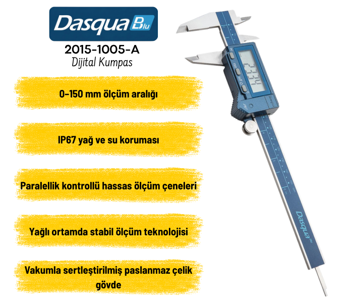 - Profesyonel kullanıcılar için geliştirilen Dasqua Blu 2015-1005-A IP67 dijital kumpas; dayanıklılık, ölçüm kararlılığı, kullanım konforu ve çok yönlü ölçüm kabiliyeti ile uzun süreli saha, servis ve atölye kullanımlarına uygun premium sınıf bir kumpas çözümü sunar.