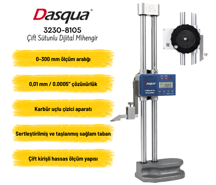 Dasqua 3230-8105 çift sütunlu dijital mihengir, granit yüzey ve benzeri referans alınabilen düz zeminler üzerinde parça yüksekliklerinin hassas şekilde ölçülmesi için geliştirilmiş profesyonel bir ölçüm cihazıdır. 0–300 mm ölçüm aralığı ve yüksek çözünürlüklü dijital yapısı sayesinde atölye, kalite kontrol ve hassas ölçüm gerektiren uygulamalarda güvenilir ve kararlı sonuçlar elde edilmesine yardımcı olur.