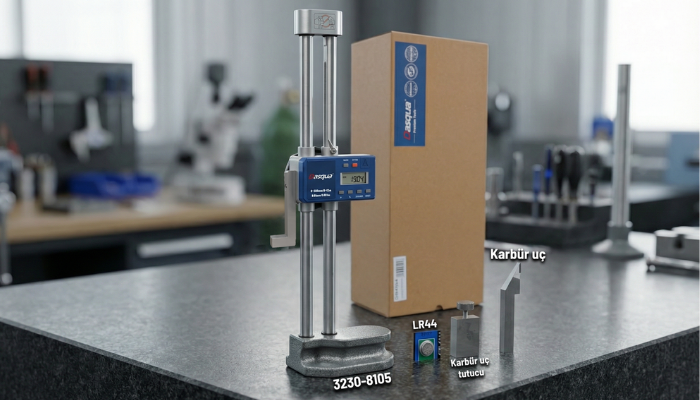 Dasqua 3230-8105 dijital mihengir, düz ve referans alınabilen yüzeyler üzerinde kullanılmak üzere geliştirilmiş; metal başta olmak üzere farklı malzemelerde hassas yükseklik ölçümü ve parça işaretleme işlemlerine uygun profesyonel bir ölçüm cihazıdır.