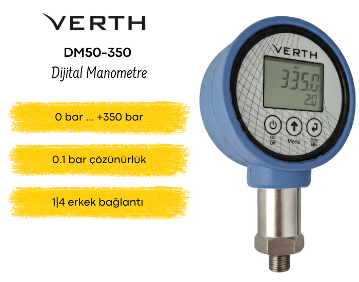 - VERTH DM50-350 modelinin basınç ölçüm aralığı 0 ila +350 bar seviyesindedir.