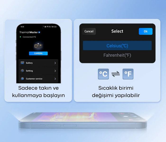 - P3 mobil termal kameramız Android 7.0 ve üzeri ile iPhone 8–17 serileriyle tam uyumlu çalışarak geniş cihaz desteği sağlar.